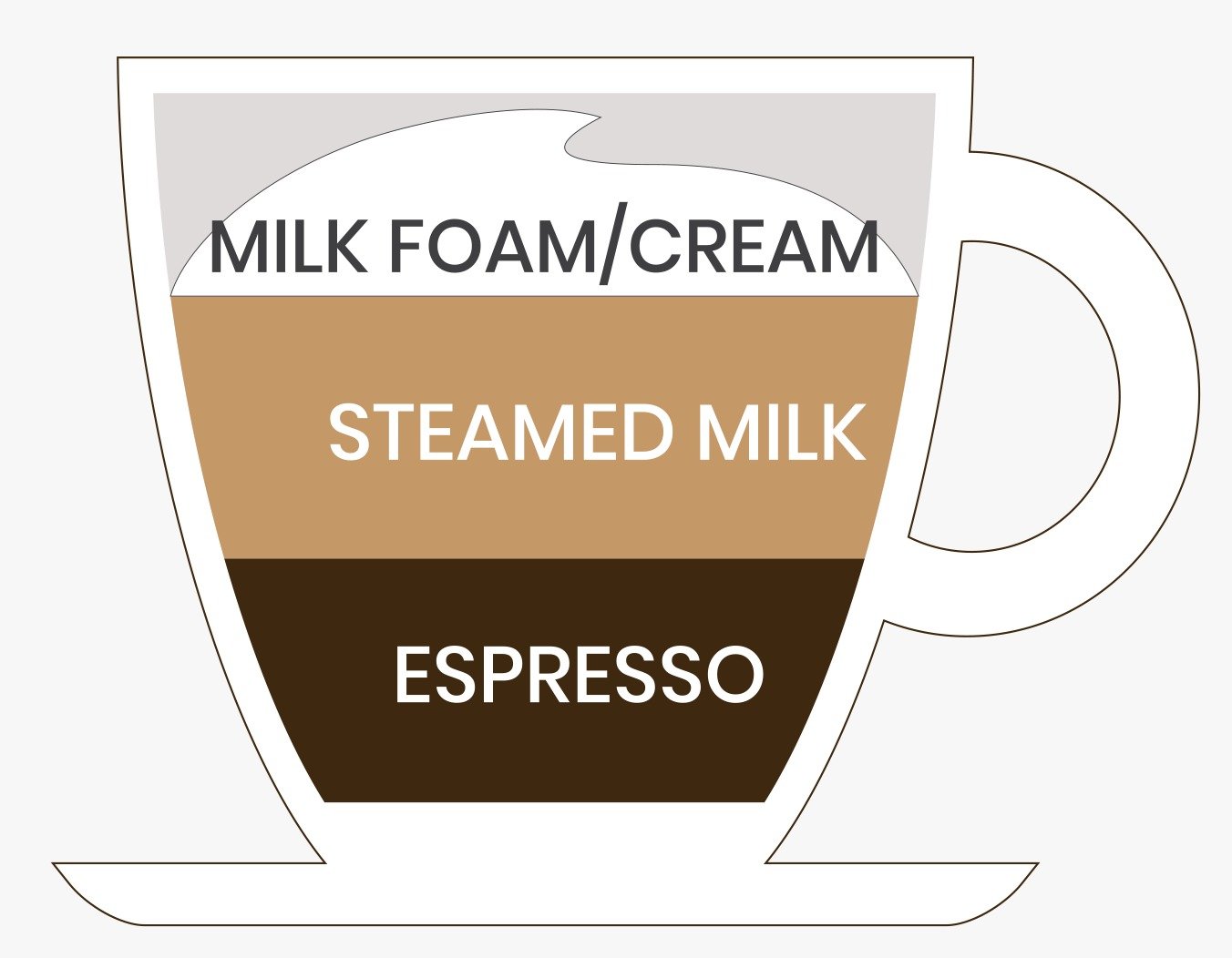Espresso, steamed milk and topped with milk foam or whipped cream